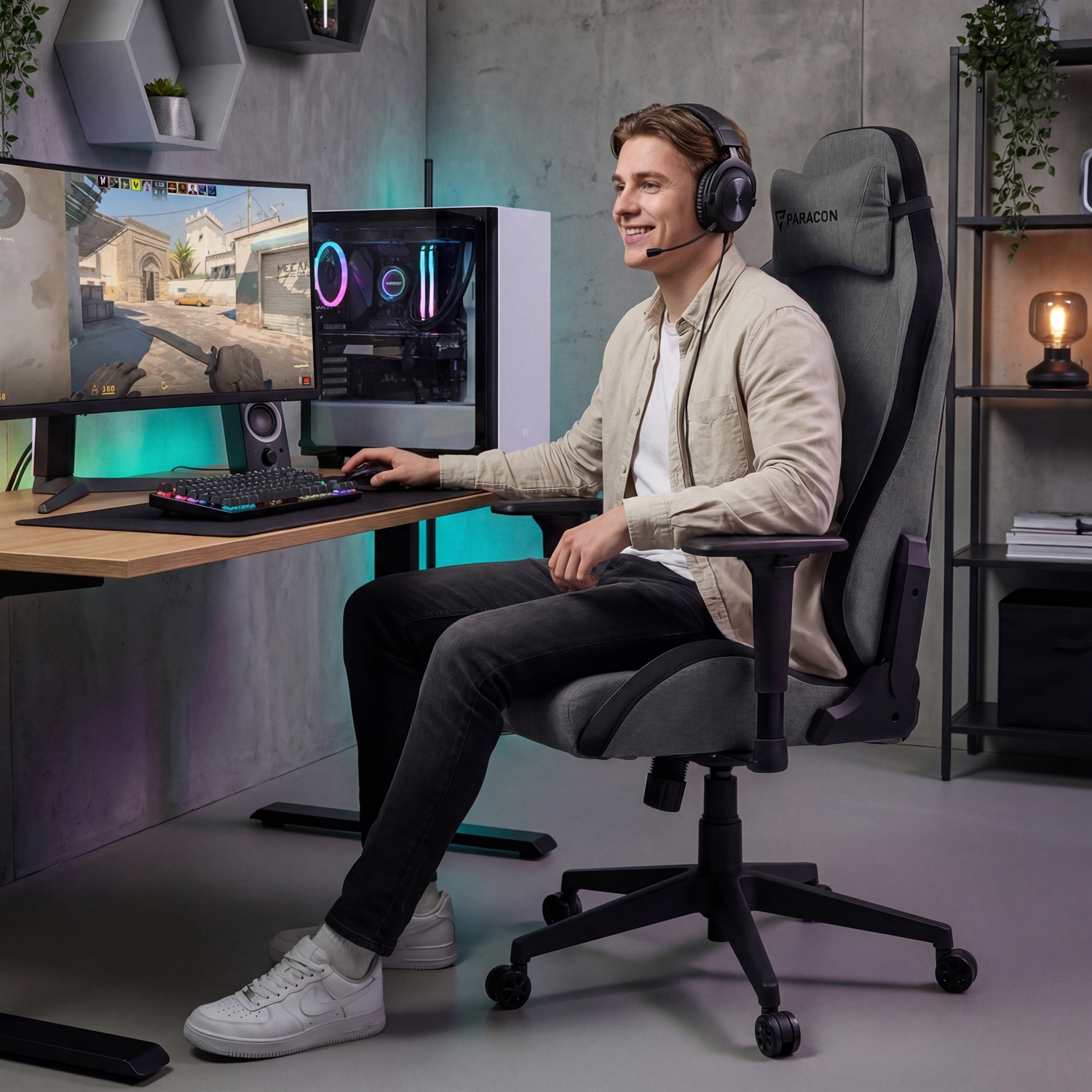 Paracon GLITCH on erittäin vankka pelituoli, joka on rakennettu maksimaalisen istuinmukavuuden saavuttamiseksi syvällisen asiantuntemuksemme avulla. Parhaita materiaaleja ja osia on käytetty, jotta voit säätää tuolin täydellisesti itsellesi sopivaksi. Tuoli on rakennettu vankalle teräsrungolle, joka takaa uskomattoman hyvän vakauden ja täydellisen kestävyyden. GLITCH-tuolissa on myös sekä niska- että lantiotyynyt. Koko tuoli on jopa verhoiltu täydellä tekstiilimateriaalilla, joka on erittäin hengittävä ja mukava pitkien pelisessioiden aikana. Paracon GLITCH on saatavana laajassa värivalikoimassa, joten voit löytää juuri oikean värin omaan kokoonpanoosi.